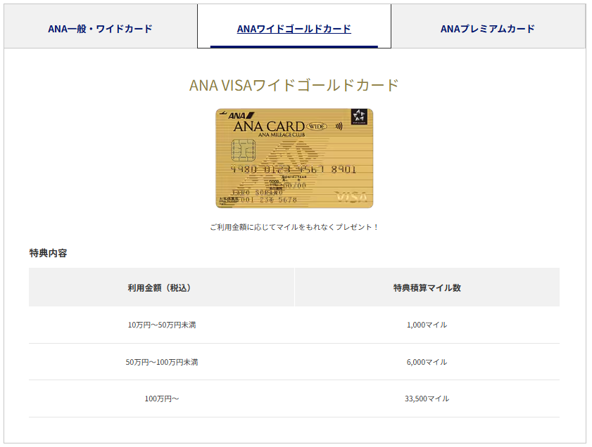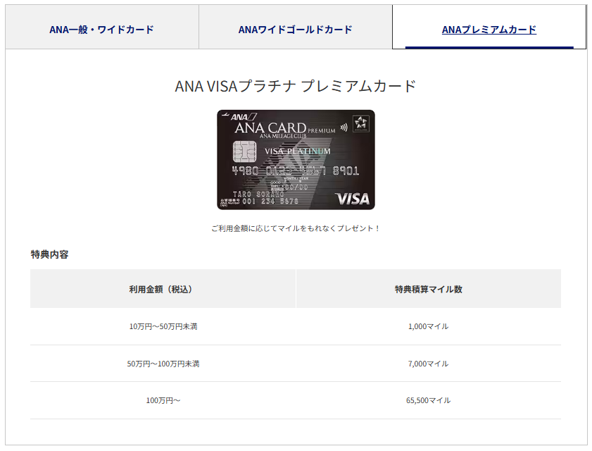 - 期間中にANAに搭乗かつ10万円のカード利用でANA VISA一般カード・ANAワイドカードは1,000ボーナスマイル、ANA VISAワイドゴールドカード・ANA VISAプラチナプレミアムカードは3,000ボーナスマイル