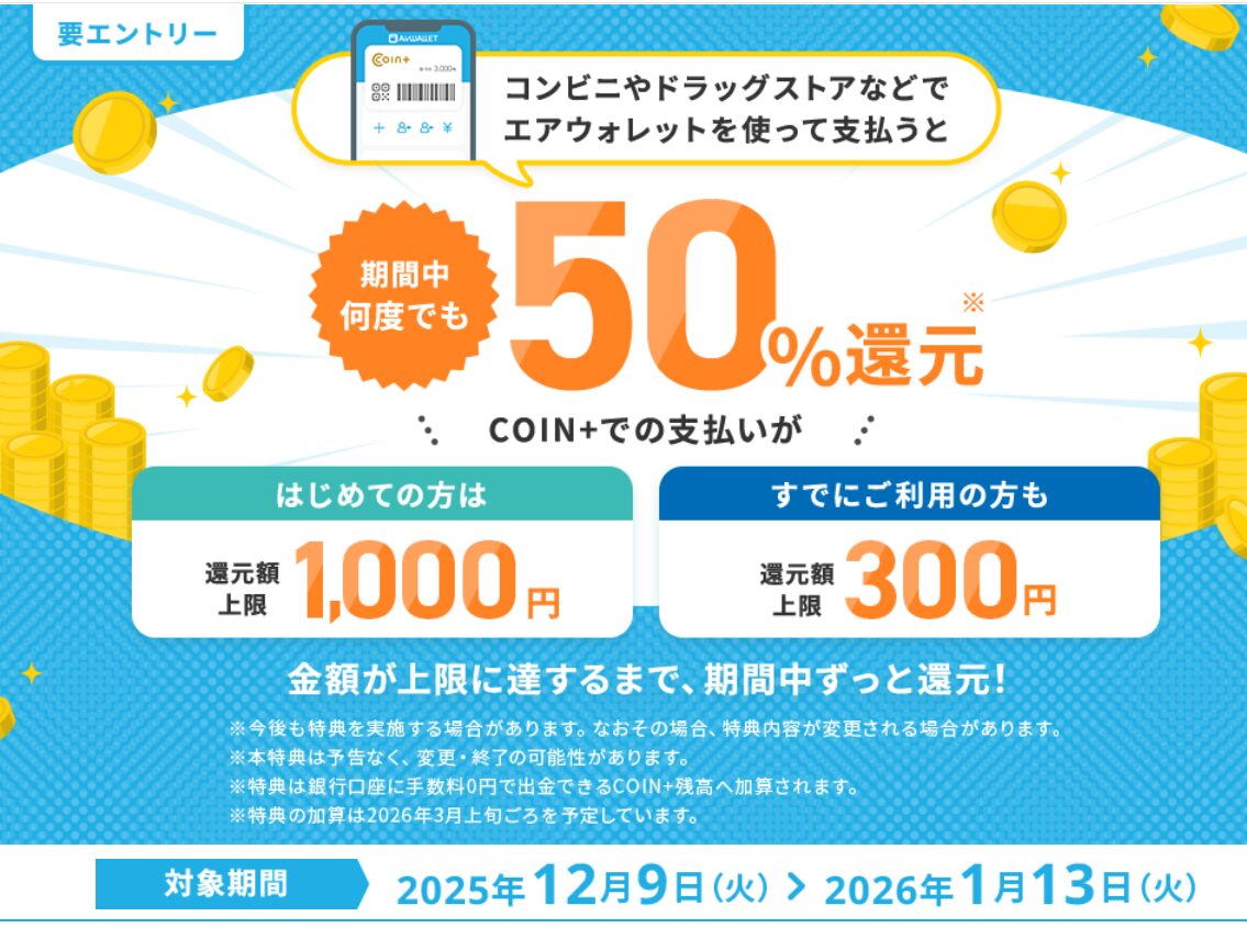 50%還元のキャンペーンも開催中です(還元の上限は初回登録者1,000円、既存会員は300円)。エアウォレットは本当にこんなキャンペーンがよく来るので、ローソン利用者にはマジで神です。