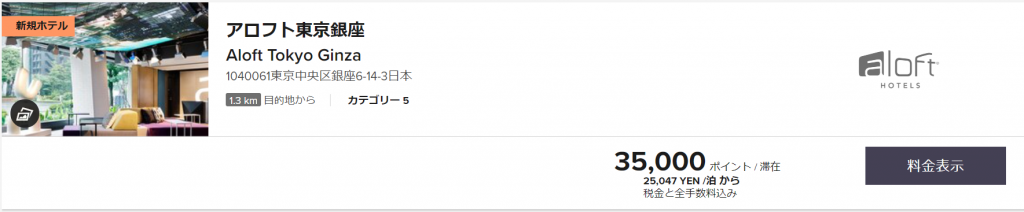 また、アロフト銀座東京のマリオットカテゴリーはカテゴリー5になっています。マリオットポイントを利用したポイント宿泊の場合には、