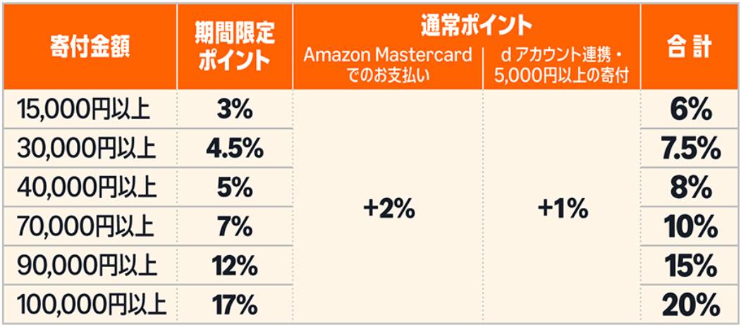 - 寄付金額に応じて3%~17%のボーナスポイント(期間限定ポイント)