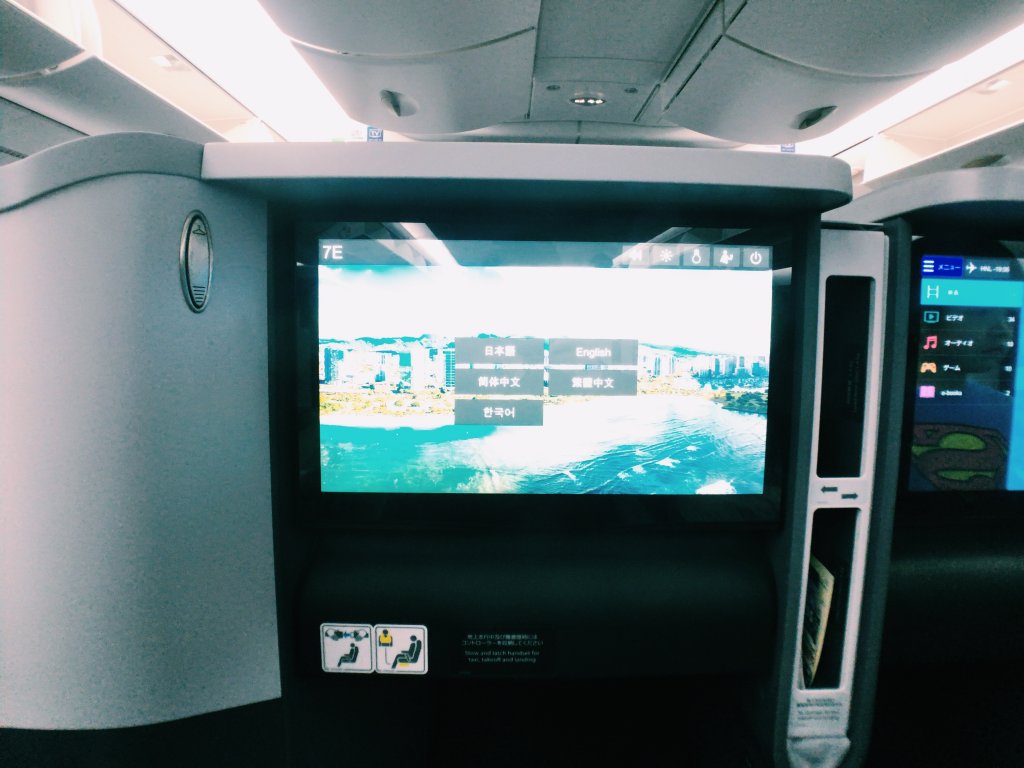 モニターはなんと18インチ。この画面で映画を満喫できます。モニターはタッチパネル式ですが、ビジネスクラスだと距離があるので、5歳の長男はシートベルトをした状態だと手が届いていませんでした。