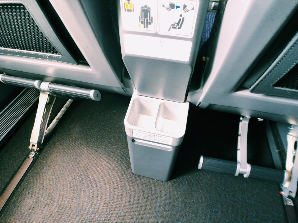 こちらは最前列になるようなバルクヘッドシート。バルクヘッドシートは、足元のスペースがかなり広く一般的にはかなり人気です。自分も国内線搭乗の際にはバルクヘッドシートを選べるなら選びますし、国際線のエコノミークラス搭乗の時にも選べるなら選びます。