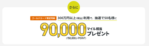 200万円利用時には通常ショッピングマイルの20,000マイルに追加して、30,000ボーナスマイル+50,000ボーナスポイントが加算される入会キャンペーンが行われています!!50,000ボーナスポイント(J-POINT)は、ANAマイルに交換の場合には1ポイント=0.6マイル相当で交換ができるので、50,000ボーナスポイント=30,000ボーナスマイルとなります。つまり、合計で60,000ボーナスマイルということですね。通常ショッピングマイルも20,000マイル加算されるので、一気に80,000マイルも獲得できるということですね!