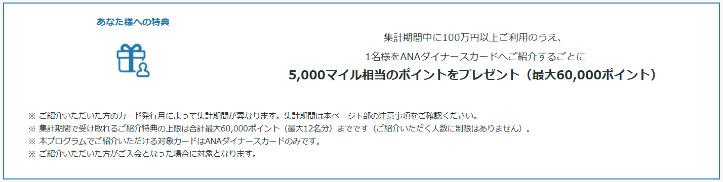 さて、ANAダイナースの入会キャンペーンですが、実はANAダイナースには「ご紹介プログラム」というものがあります。紹介キャンペーンを積極的に展開している会社としては、アメックスが有名ですが、実はダイナースにも紹介制度があります。