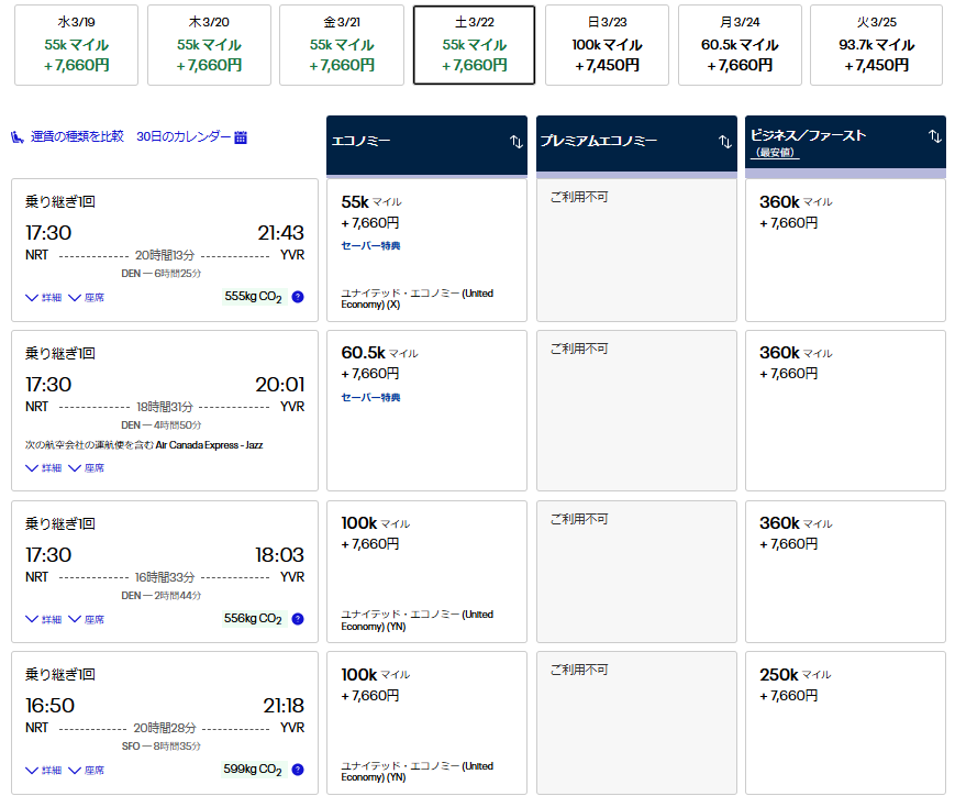 ちなみにちょっとマニアになると気になる点としては、ユナイテッド航空マイレージプラスなどなど他社のマイルでも直前開放の枠ってあるのかという点ではないでしょう。ということで、ユナイテッド航空マイレージプラスで、東京=バンクーバーの3/22も検索してみました。