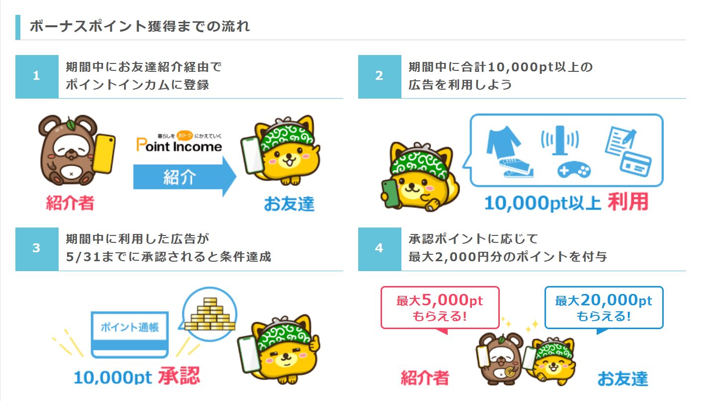 ポイントインカムの入会キャンペーンは、最大でステージ7の人からの紹介で3,000pt+1,000pt=400円相当がもらえるので、めちゃくちゃお得です!ぜひ下記バナーよりガンガンご登録ください!!!