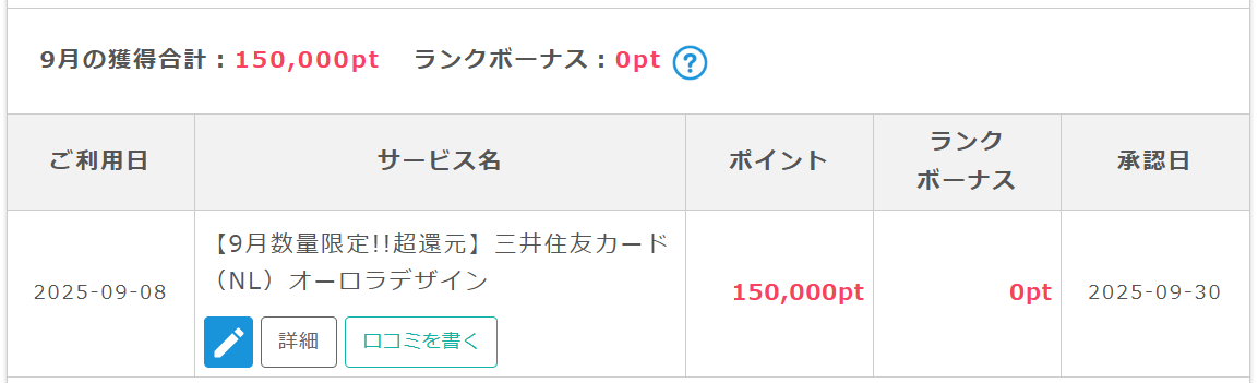 なんと、15,000円分のポイントが確定しました(9月は今よりポイントがちょっと高かったです)!!!すごい。ということで、みなさんもクレカを2枚する場合にも、念のためにポイントサイトを経由することを強くオススメします。ちなみに楽天カードなんかは、ポイント付与されないです。が、三井住友カードNLは2枚持ちでポイント付与されました。みなさんが申込される場合に、この記事が何らかの保証になるわけではないですが、参考になれば幸いですね。