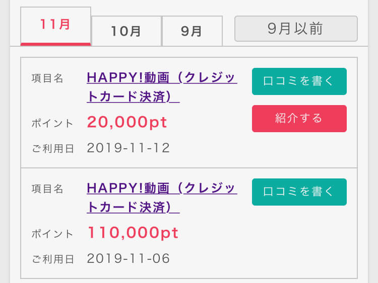 上記のような11,000円の月額会員制動画サイトが出てくる(スマホ限定)ので、上記に登録をすると、数分後に110,000pt(10pt=1円なので11,000円相当)が付与されるものが多数存在します。