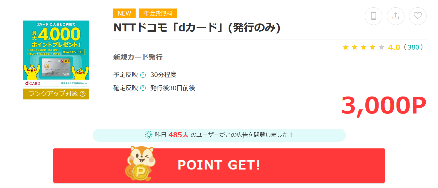 なんと、ポイント条件は、カードの発行のみでOKです。発行後のカード利用条件や、キャッシング枠の設定等の条件はありません。そして、ドコモユーザー以外でも、dアカウントを作成して申し込みをすればポイント付与されます。