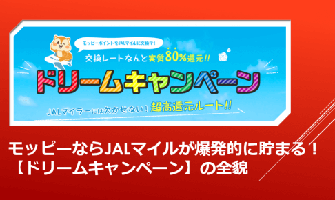 というような戦略がいいでしょう。是非、頭の片隅に置いておきましょう。今回のdポイント10%増量キャンペーンは、この3つ目に該当するキャンペーンです。すでにご存じの方も多いでしょうが、モッピーのドリームキャンペーンだけはJALマイルを貯める上で知っておいてくださいね。通常はポイント交換でJALマイルにすると、2円=1マイルの交換レート50%の交換になりますが、ドリームキャンペーンは80%という異次元の内容ですからね。