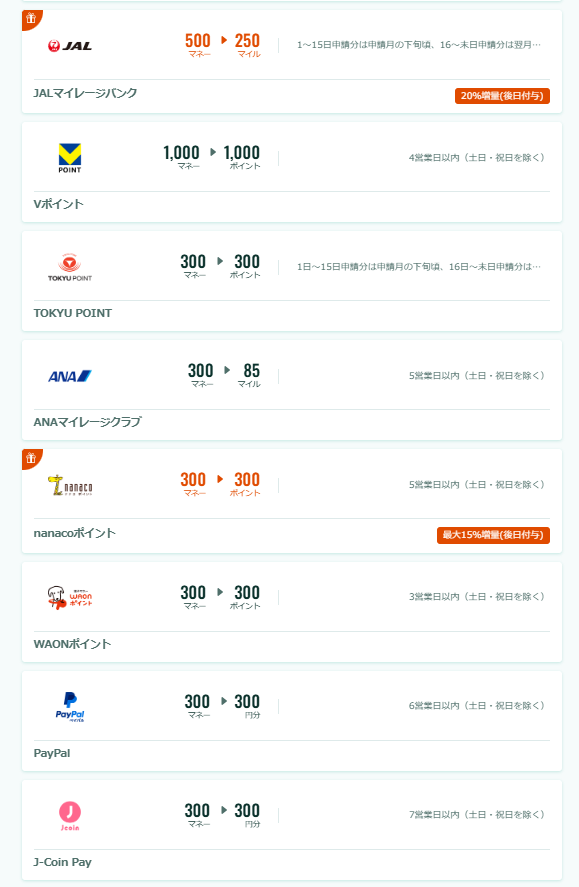 上記はドットマネーから交換できるポイントやマイルに一部ですが、JALマイルへの交換レートが50%だったり、Vポイントへの交換手数料が無料だったりと、非常に使い勝手がいいので、みなさんも利用していたりするのではないでしょうか。Vポイントなんかは、ハピタスから直接ポイント交換すると手数料が取られますからね。ハピタスのヘビーユーザーには残念ですよね。