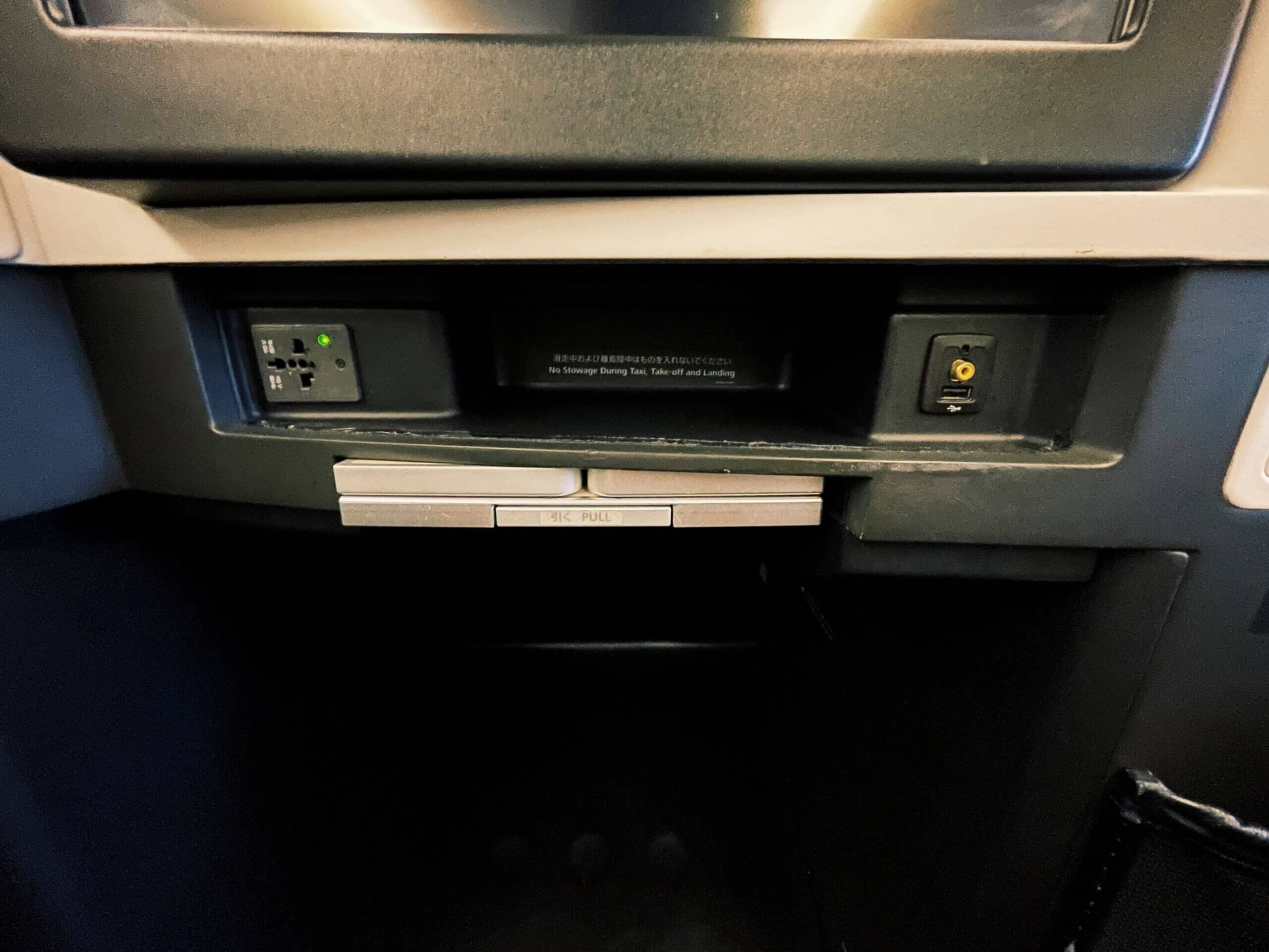サイドテーブルには収納があり、水や化粧品などなど機内で使いそうなものを収納しておくことが可能です。やはり、ビジネスクラスはいいですね!!!特典航空券のおかげです!