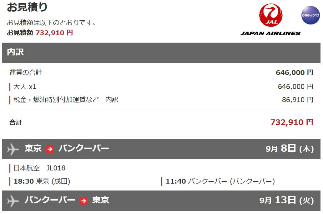 今回、自分は成田=バンクーバー路線で、JAL国際線ビジネスクラスに搭乗したわけですが、通常に購入すると値段もかなり高いんですよね。
