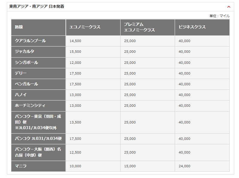 となっています。実はここだけを見ると改悪とわけでもなく、たしかにシンガポールのエコノミークラスは12,000→13,000マイル、バンコクのプレミアムエコノミー(JL31/34)は25,000→30,000マイル、ビジネスクラスは40,000マイル→45,000マイルになっていたりもします。が、ハノイ&ホーチミンはビジネスクラスが40,000→30,000マイルと10,000マイルも減額になるなどかなりの改善もあることはあるんです。