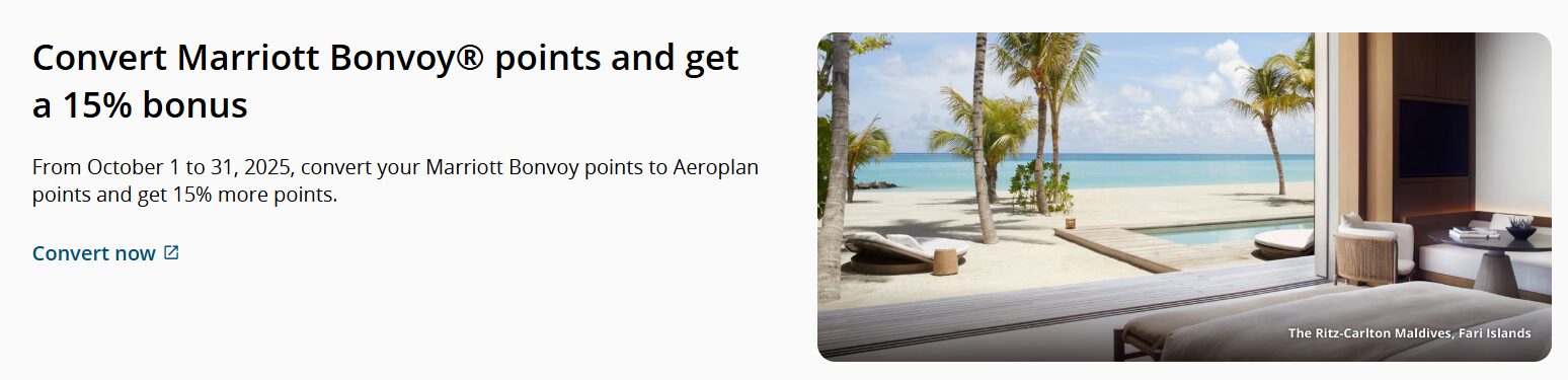 2025/10/31まで。マリオットポイントからエアカナダ「Aeroplan」へのマイル移行で15%増量。