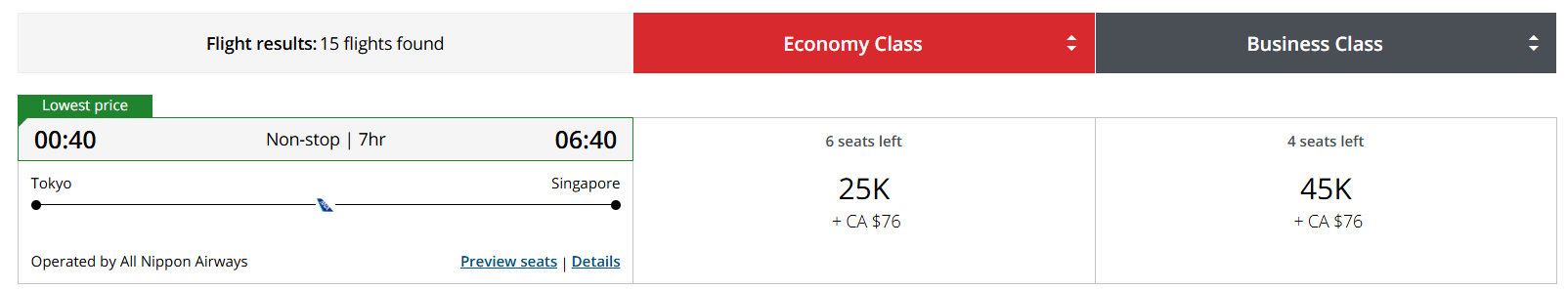検索すると、必要マイル数は東京=シンガポールの片道で、
