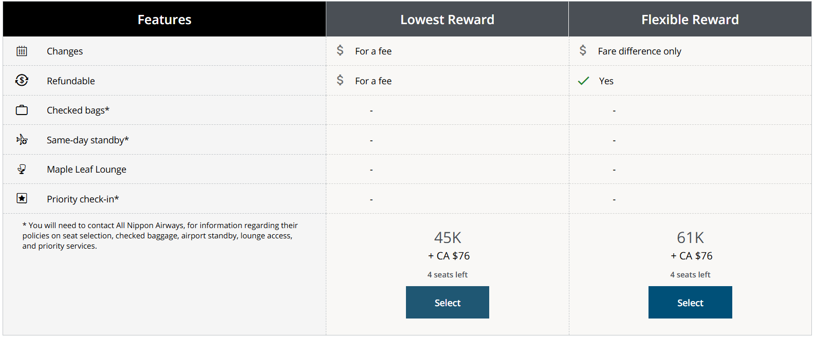 - Lowest Reward:必要マイル数は少ないが、変更・キャンセルは手数料高額(150カナダドル)