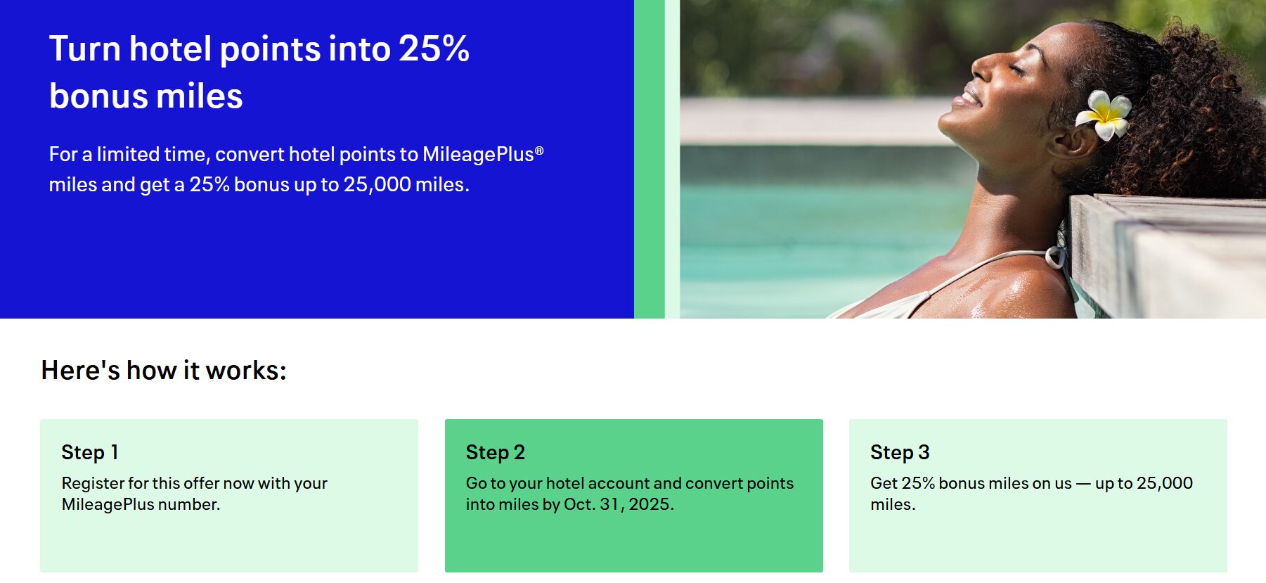 - Qualifying activity:A member must earn award miles as a result of one or more points to miles conversion transactions from any combination of MileagePlus hotel partner programs that offer a points to miles transfer program that are conducted during the Promotional Period (“Qualifying Activity”) in order to qualify for MileagePlus Hotel Points-to-Miles bonus miles (“Bonus Miles”). Qualifying Activity must be completed by 11:59pm EST on October 31, 2025.
