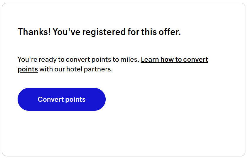 上記のような画面が出るはずなので、これで登録完了です。あとは、マリオットなどのポイントを移行すればOKです。登録より先に移行しても25%増量されないので、必ず先にキャンペーン登録をしてください。