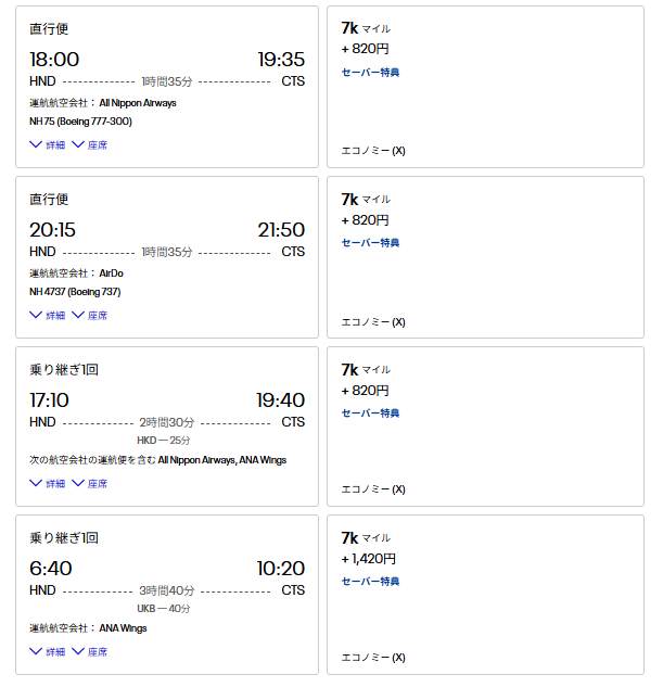 しかもですよ、経由便でも必要マイル数は変わらないんです。これがめちゃくちゃ面白くて、例として、羽田→新千歳の特典航空券を検索してみると、