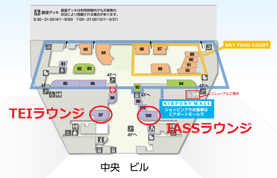 上記のように、4階から中央エレベーターであがると目の前の位置に通路を挟む形で「IASSラウンジ」「TEIラウンジ」が位置しています。ラウンジホッピングもしやすい場所です。