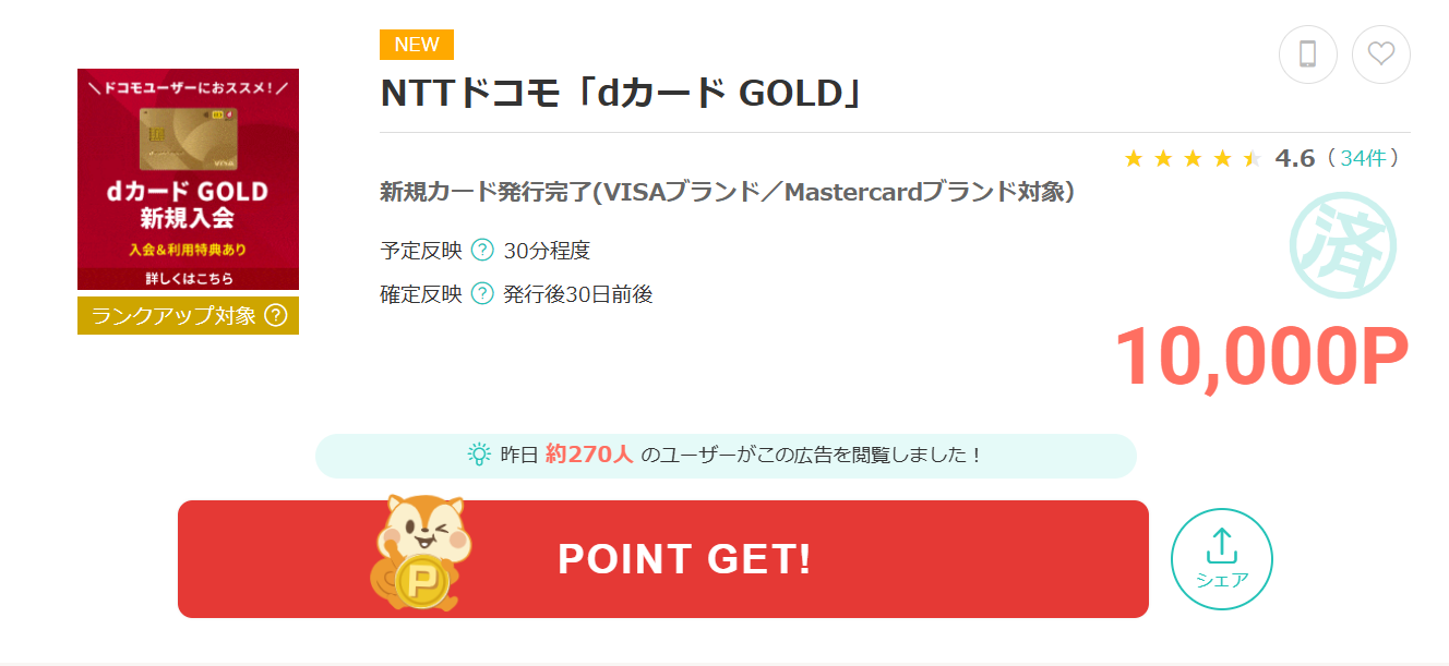 あっ、あと非常に重要なことを言い忘れていました。dカードゴールドにモッピー経由で申込すると、dカードからも入会キャンペーンのポイントがもらえます。dカードの入会キャンペーンの詳細はこちらに出ていますが、