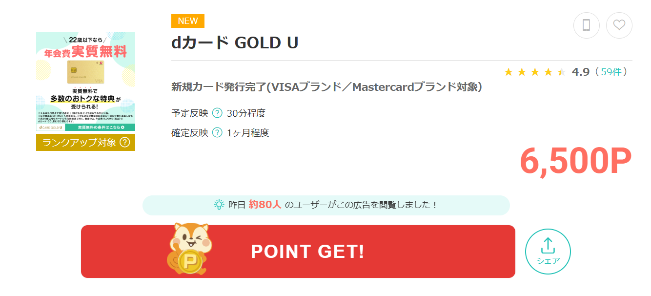 dカードゴールドUの申込なら、6,500P=6,500円相当がもらえます。