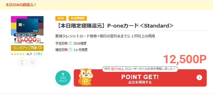 ポイントサイト「モッピー」経由で「P-oneカード<Standard>」を発行すると、年会費無料なのに、それだけで12,500円がもらえる!!