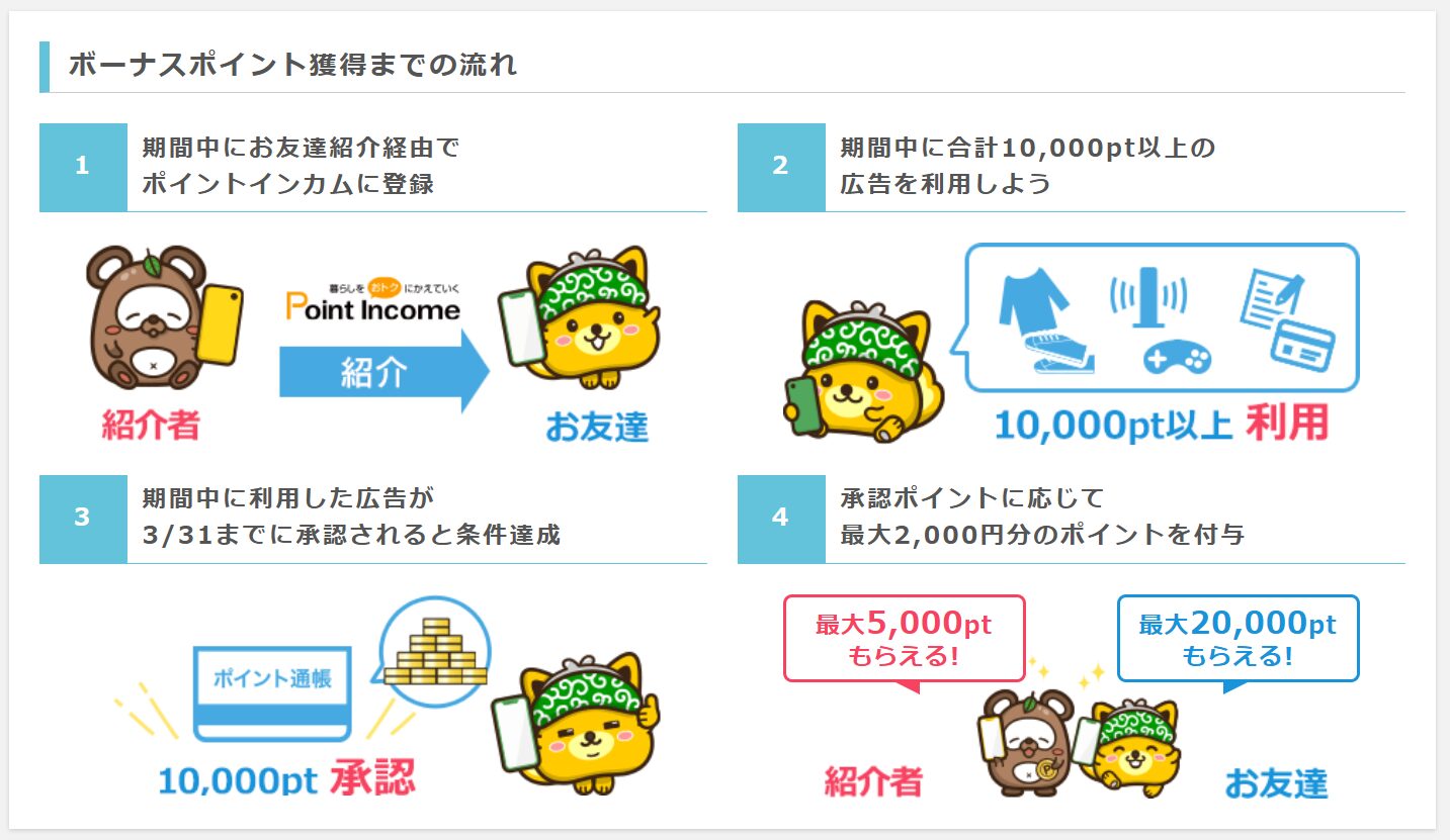 これがポイントインカムの最もお得な入会キャンペーンになっています。ということで、当サイトからの紹介で3,000ptがもらえるので、ぜひ下記バナーよりガンガンご登録ください!!!