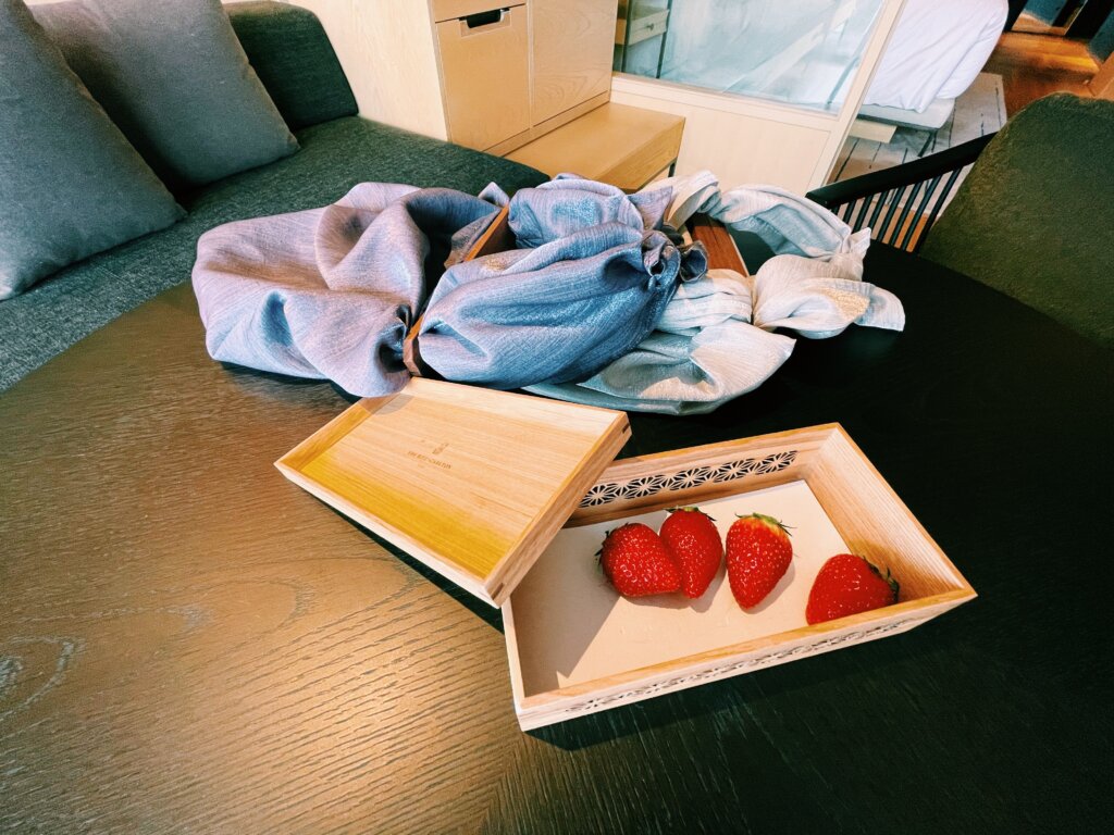 そして、机の上の木箱には栃木産のイチゴがウェルカムフルーツとして用意されています。