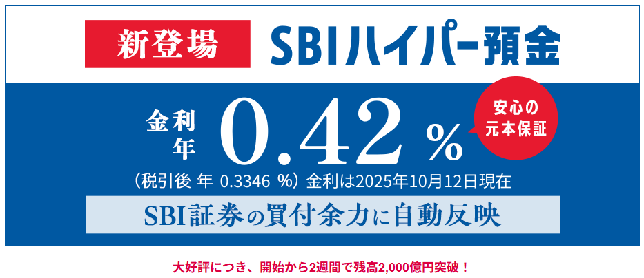 が、SBI新生銀行のSBIハイパー預金というやつがさらに強烈なんですよね(SBIハイパー預金は2025/9/23に登場したばかりです)。SBI新生銀行のSBIハイパー預金というやつもSBI証券との提携で自動資金移動が行えるタイプの預金でありながら、なんと金利が0.42%という激熱すぎる内容になっており、住信SBI銀行から乗り換えをする人が続出中なんです。