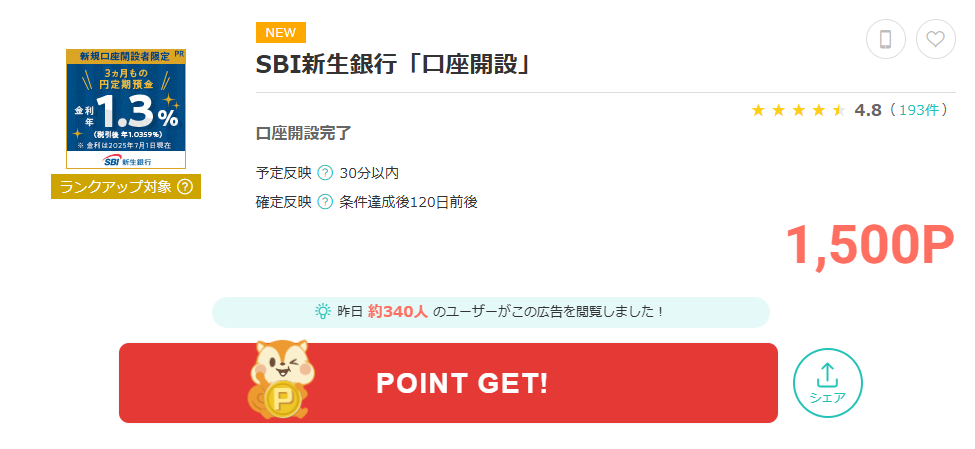 上記が出てくるので「POINT GET!」をクリックして、SBI新生銀行に口座開設をしましょう。それで1,500P=1,500円相当がもらえます!