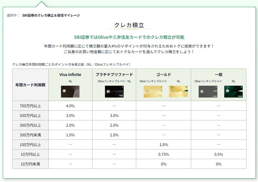 そして、今回キャンペーンとして発表されたのが、「三井住友カード つみたて投資(SBI証券とのクレカ積立)」のOlive限定上乗せプランというもので、三井住友カードのサイトを引用すると、