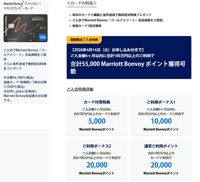 以上の合計5.5万ポイントが獲得できます。2026/4/14申込分まで大幅ポイントアップ中なので、超オススメです!