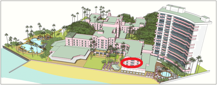 隣の少し背の高い棟が、マイラニタワーというやつで、オーシャンビューで人気なんですよね。が、そのマイラニタワーよりも一歩海に近いオーシャンビューに位置するのがロイヤルハワイアンスイートです。